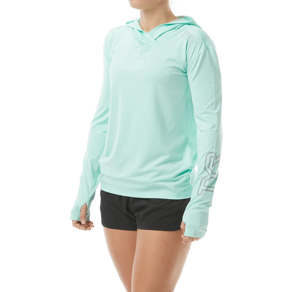 Gear up in the TYR Women’s SunDefense Hooded Shirt. The TYR SunDefense collection has the most effective UV protectant coverage for outdoor adventurists. With UPF 50+ to block UVA and UVB rays for hard-core sun protection, in addition to SunDefense QuickDry, moisture-wick fabrication and superior breathability, the SunDefense apparel is a must-have for any athlete’s arsenal.